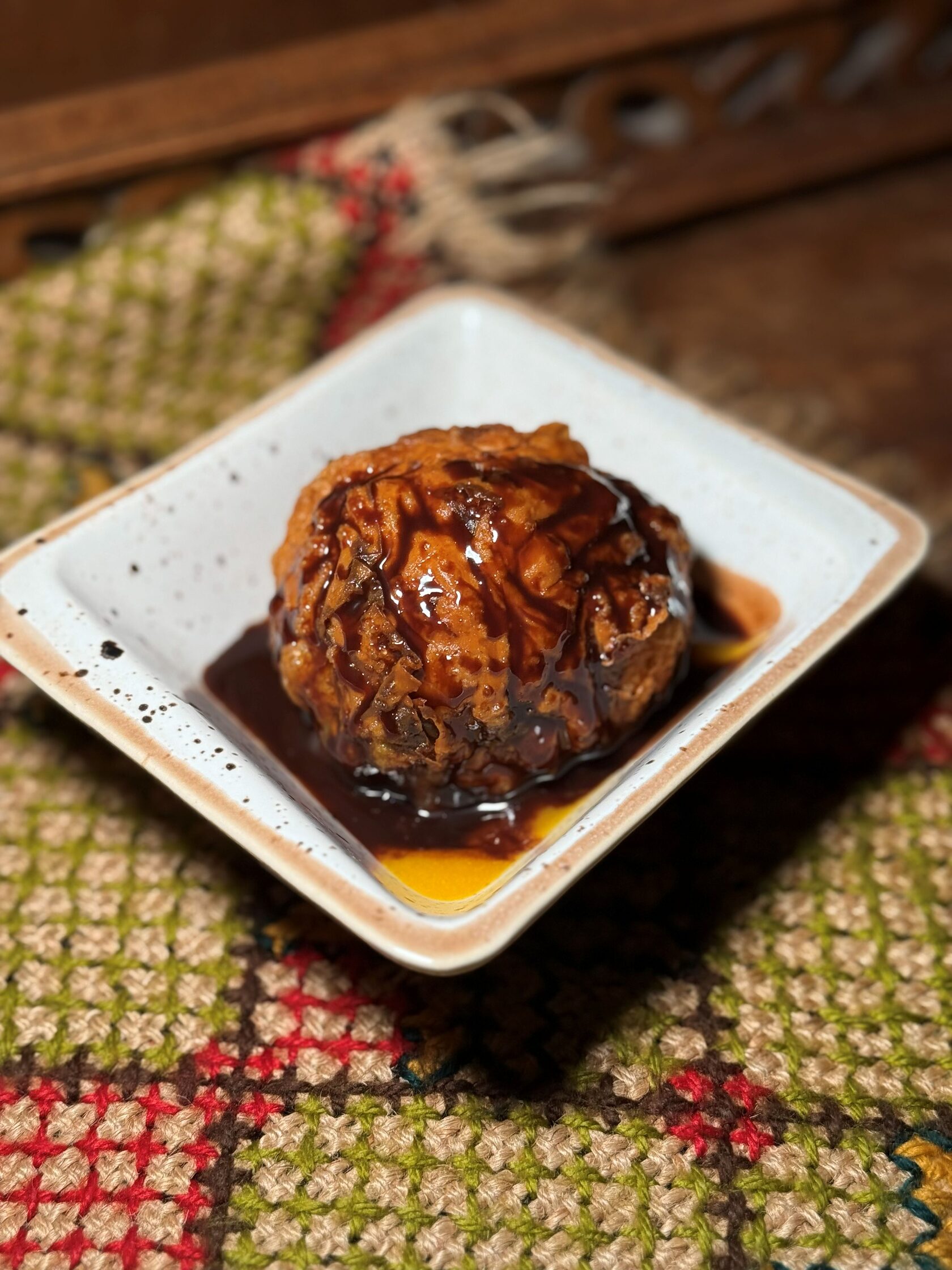 Мороженое жаренное в хрустящем тесте фило подаем с муссом из персиков