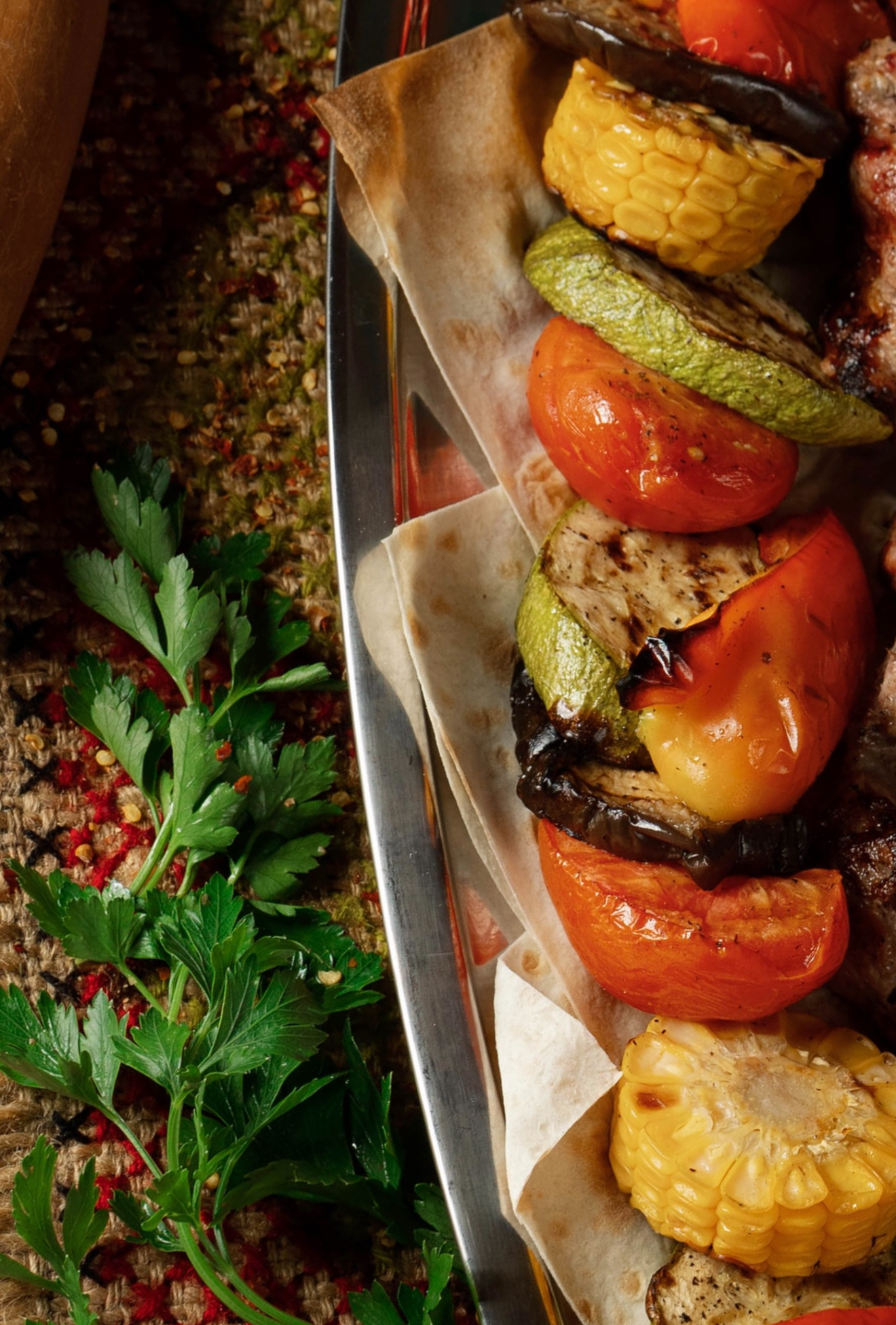 Баклажаны, цуккини, сладкий перец, томаты, вареная кукуруза, соус из кинзы