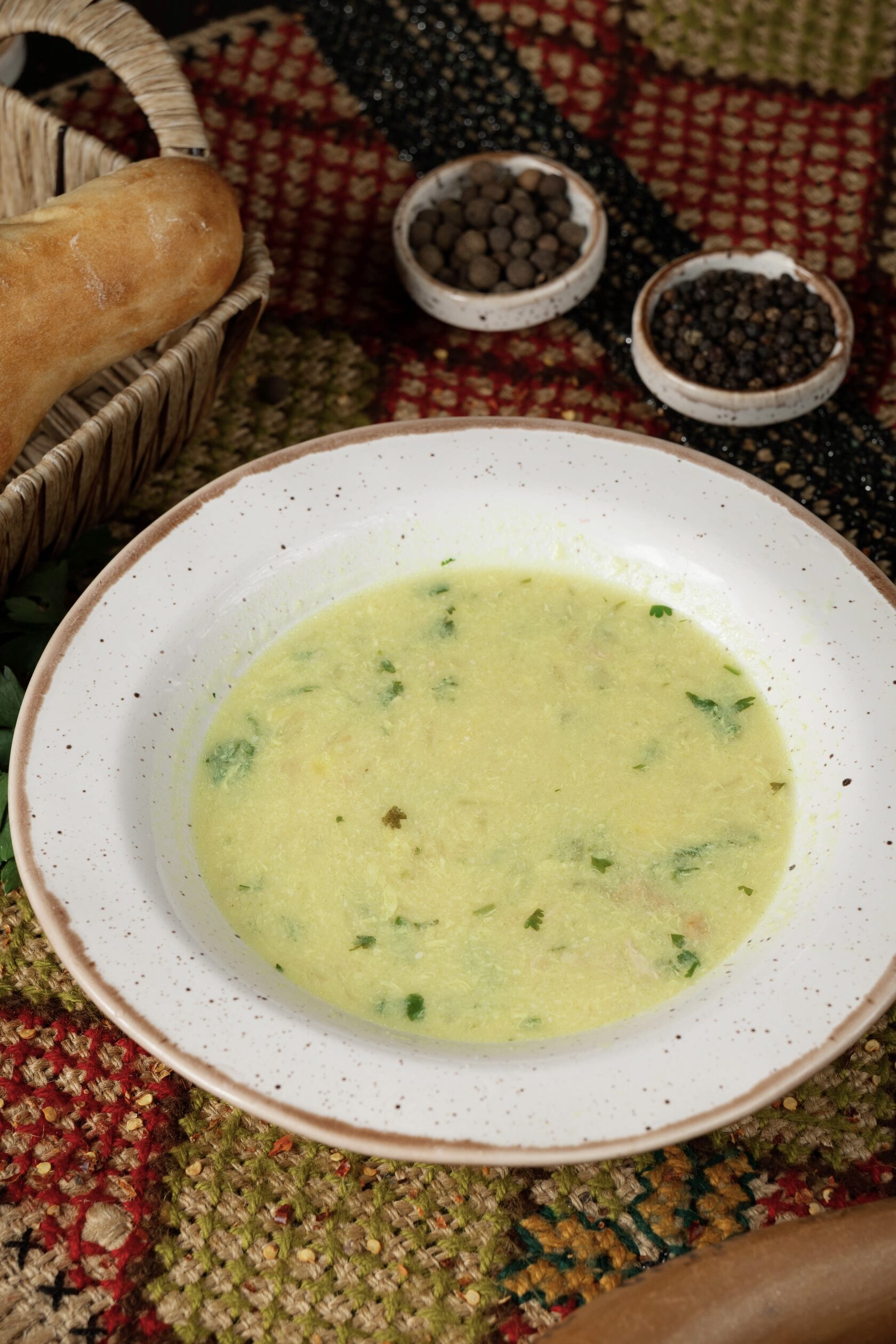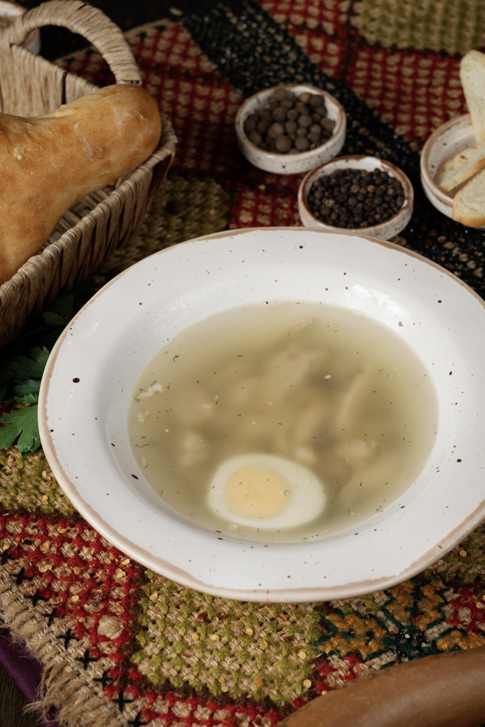 Густой куриный бульон с возбуждающей аппетит кислинкой, заправлен куриным филе, яйцом и травами. С похмелья возвращает к жизни не хуже чем хаш
