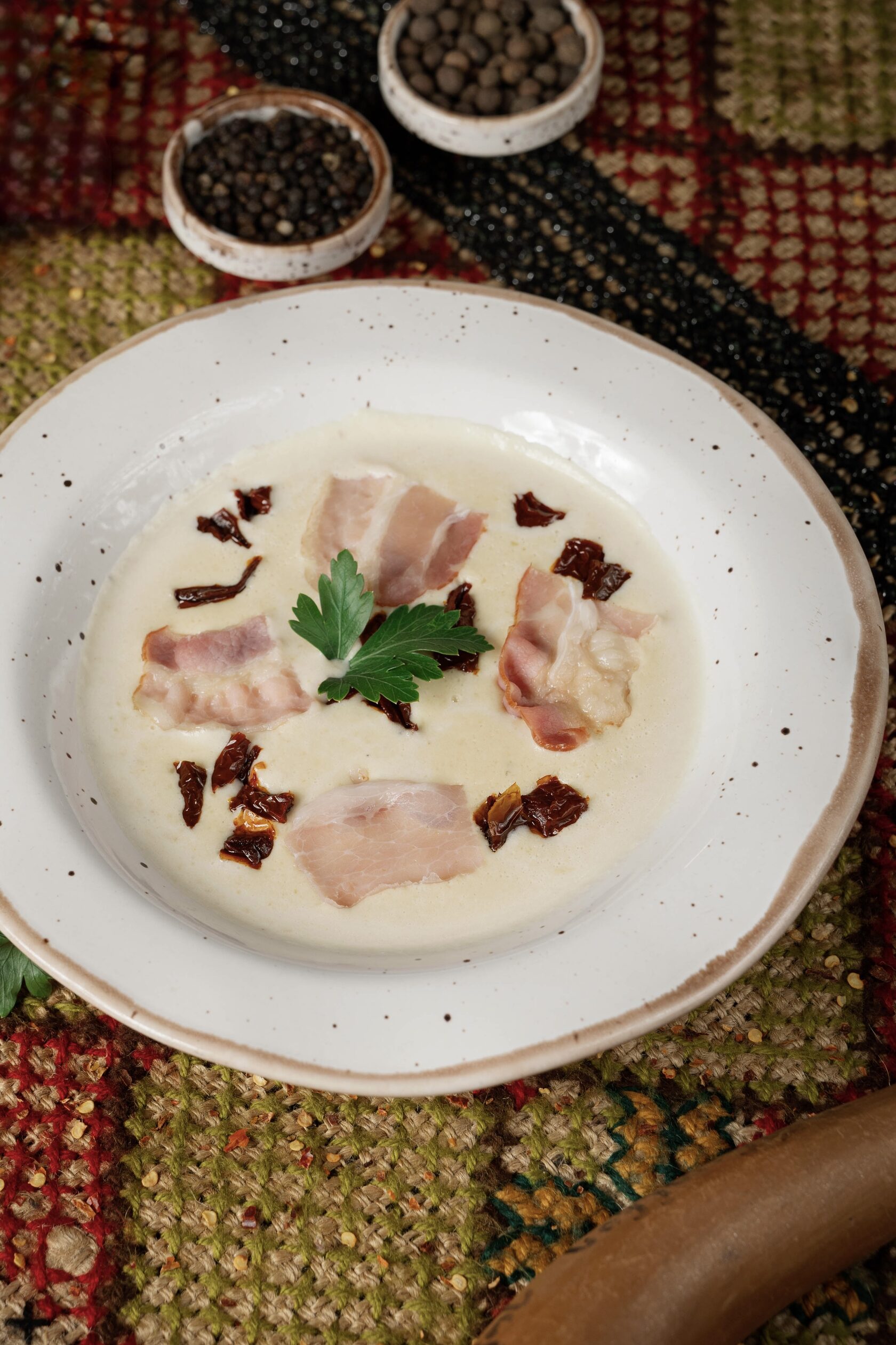 Крем-суп из сельдерея с беконом и вялеными томатами